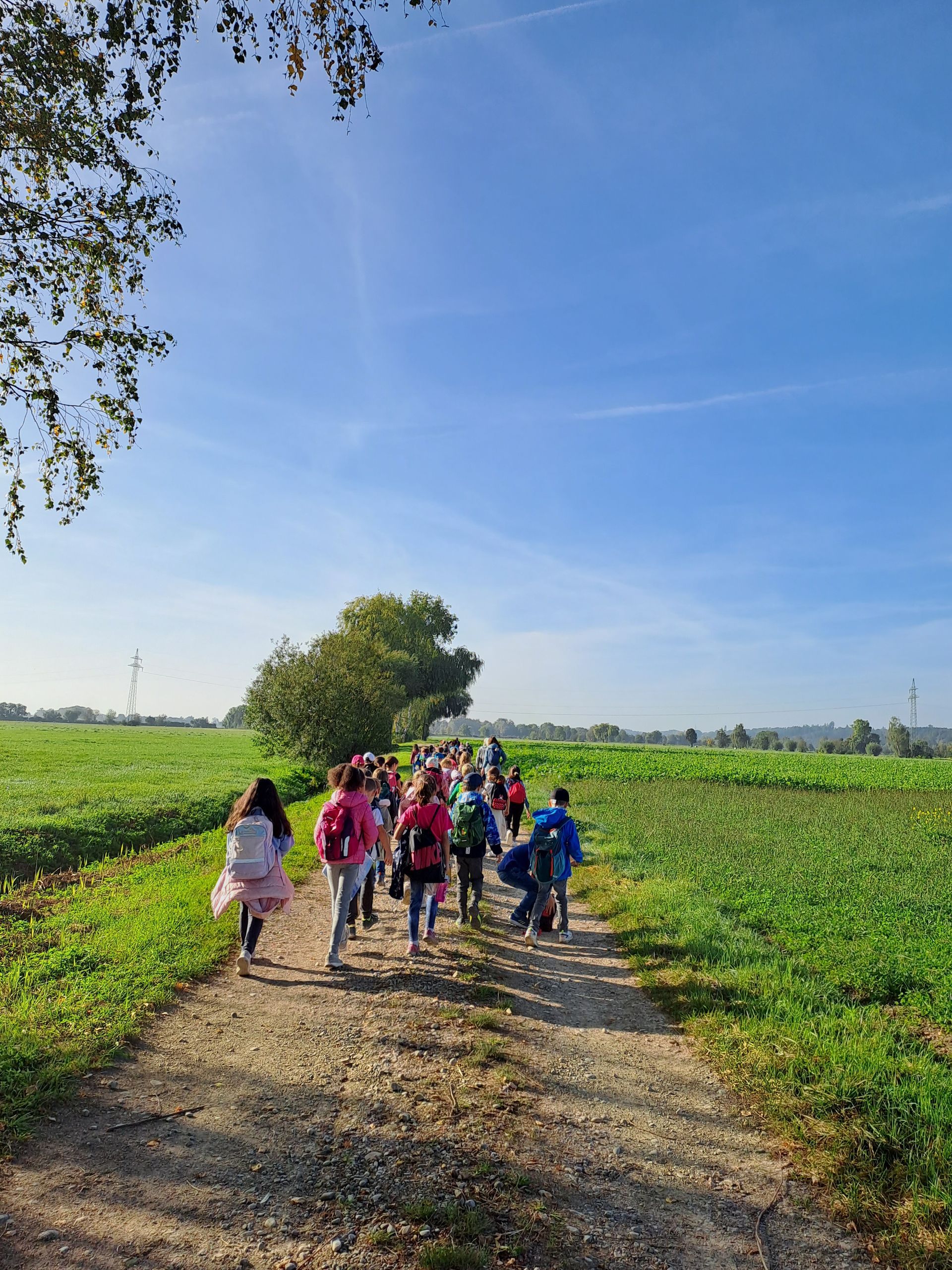 Bei herrlichem Sonnenschein und angenehm milden Temperaturen wanderten Anfang Oktober drei zweite Klassen nach Westendorf. Zuerst durften sich die Kinder am Spielplatz austoben. Vor allem die Seilbahn und das große Klettergerüst waren sehr beliebt. Nach einer Brotzeit ging es, inmitten von Wiesen und Feldern, weiter zur Kneippanlage. Auf unserer Wanderung sammelten wir viele verschiedene Blätter und Blumen und beobachteten auch einige Graureiher, die in den Wiesen nach Beute suchten.