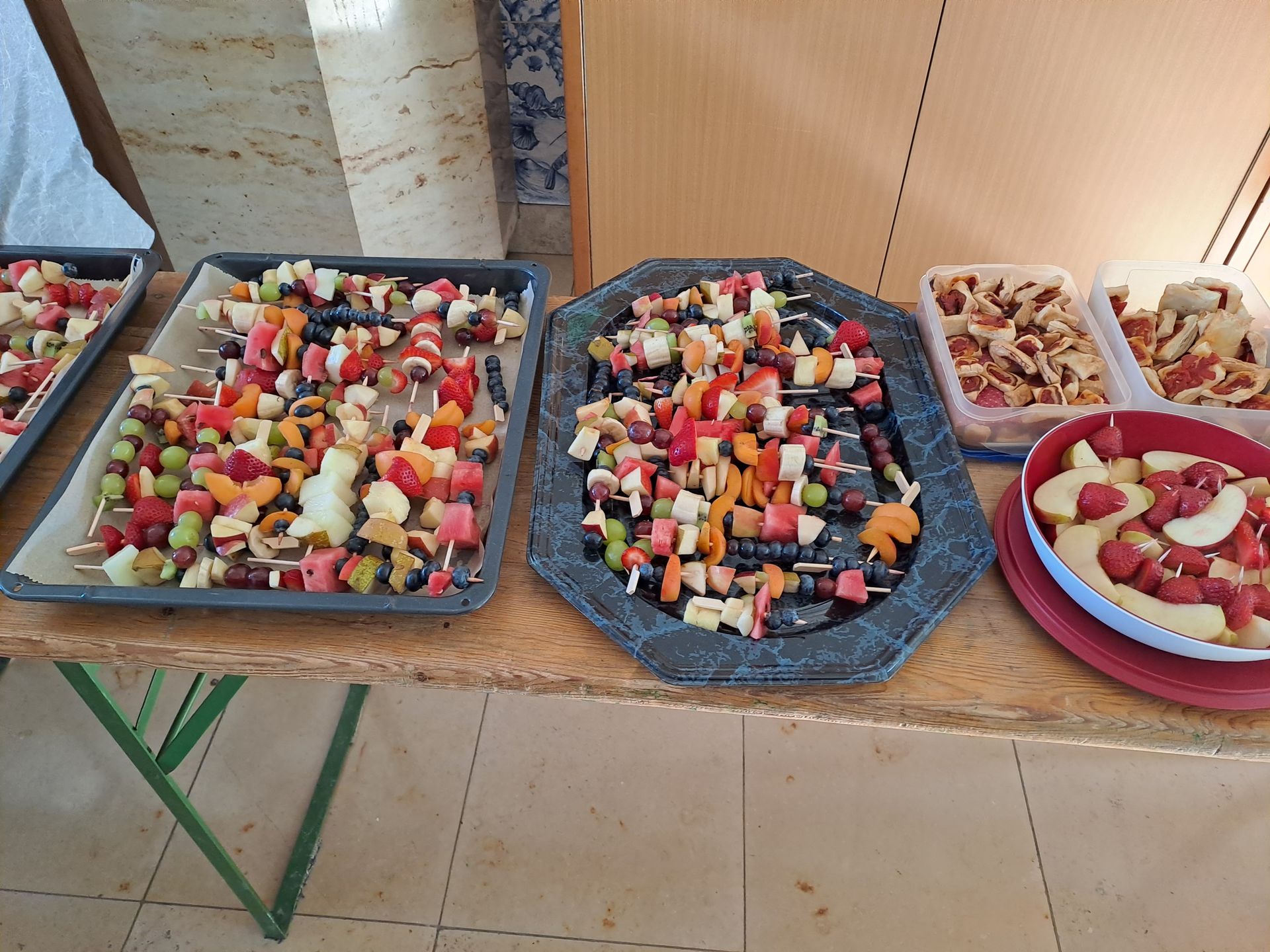 Anschließend durften sich alle Kinder, gegen eine kleine Spende, am sehr reichlichen Buffet mit Häppchen, Muffins, Obst, Gemüse und allerlei sonstigen Leckereien stärken. Der Erlös des Buffets wird an die KlinikClowns in Augsburg sowie an Kinder und deren Familien auf den Philippinen gespendet.