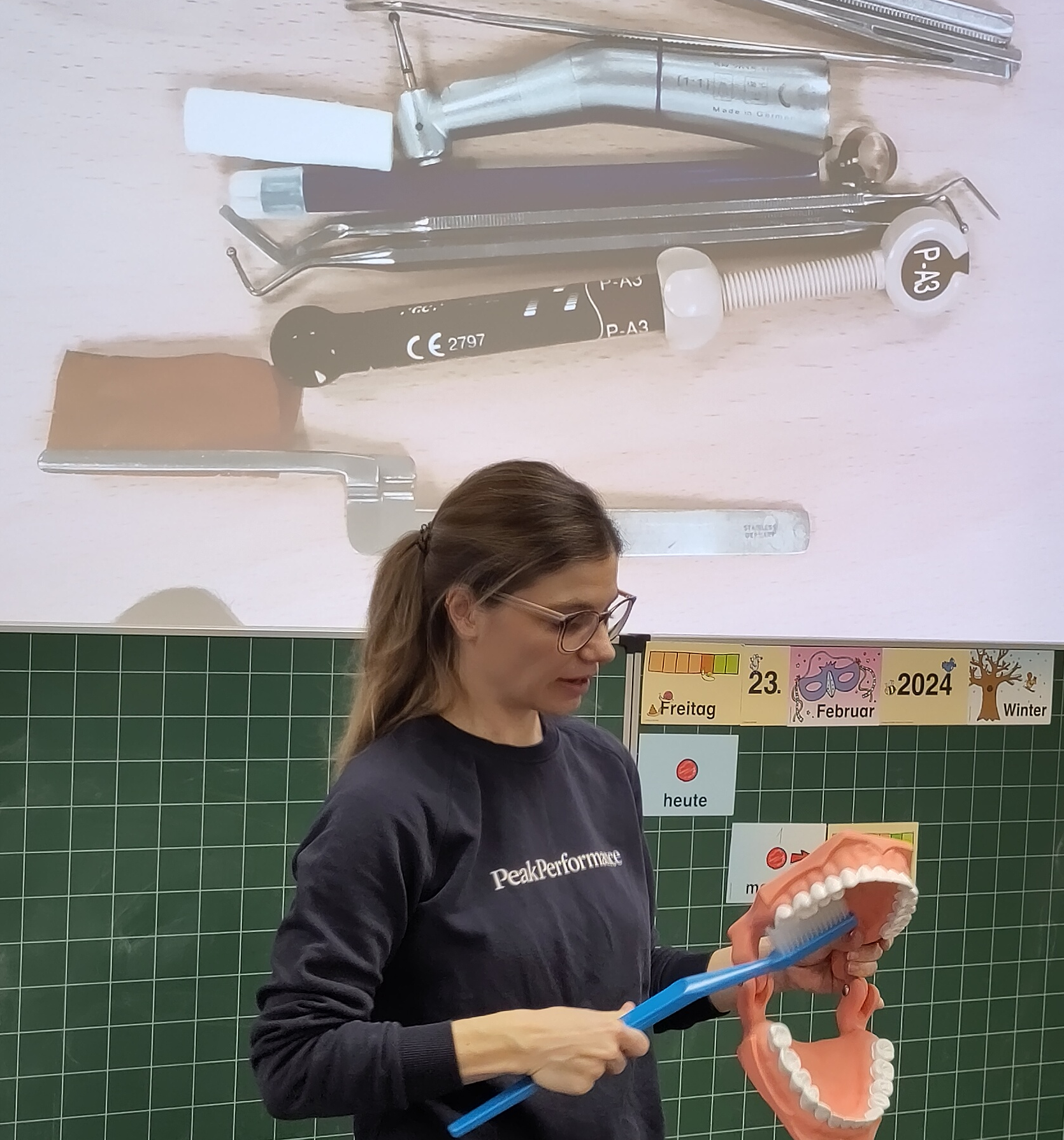 Am 22.02. und 23.02.2024 bekamen unsere ersten Klassen Besuch von Zahnärztin Frau Dr. Mader. Aufmerksam hörten alle Kinder zu, als die Zahnärztin ihre Werkzeuge vorstellte oder vom Aufbau des Gebisses erzählte. Anschließend wurde anschaulich von Frau Dr. Mader mit Hilfe eines großen Gebisses und Zahnbürste erklärt, wie man richtig Zähne putzt (K-A-I) und was dabei wichtig ist. Nachdem dies geklärt war, durften die Kinder verschiedene Lebensmittel ordnen, je nachdem, ob diese gut oder schlecht für unsere Zähne sind. Die Schüler berichteten außerdem gerne über ihre eigenen Wackelzähne und Erfahrungen beim Zahnarzt. Als kleinen Abschluss erhielt jedes Kind ein Geschenk, bestehend aus Zahnputzbecher, Zahnpasta und natürlich einer Zahnpasta. So kann die Zahnpflege nun gut gelingen.