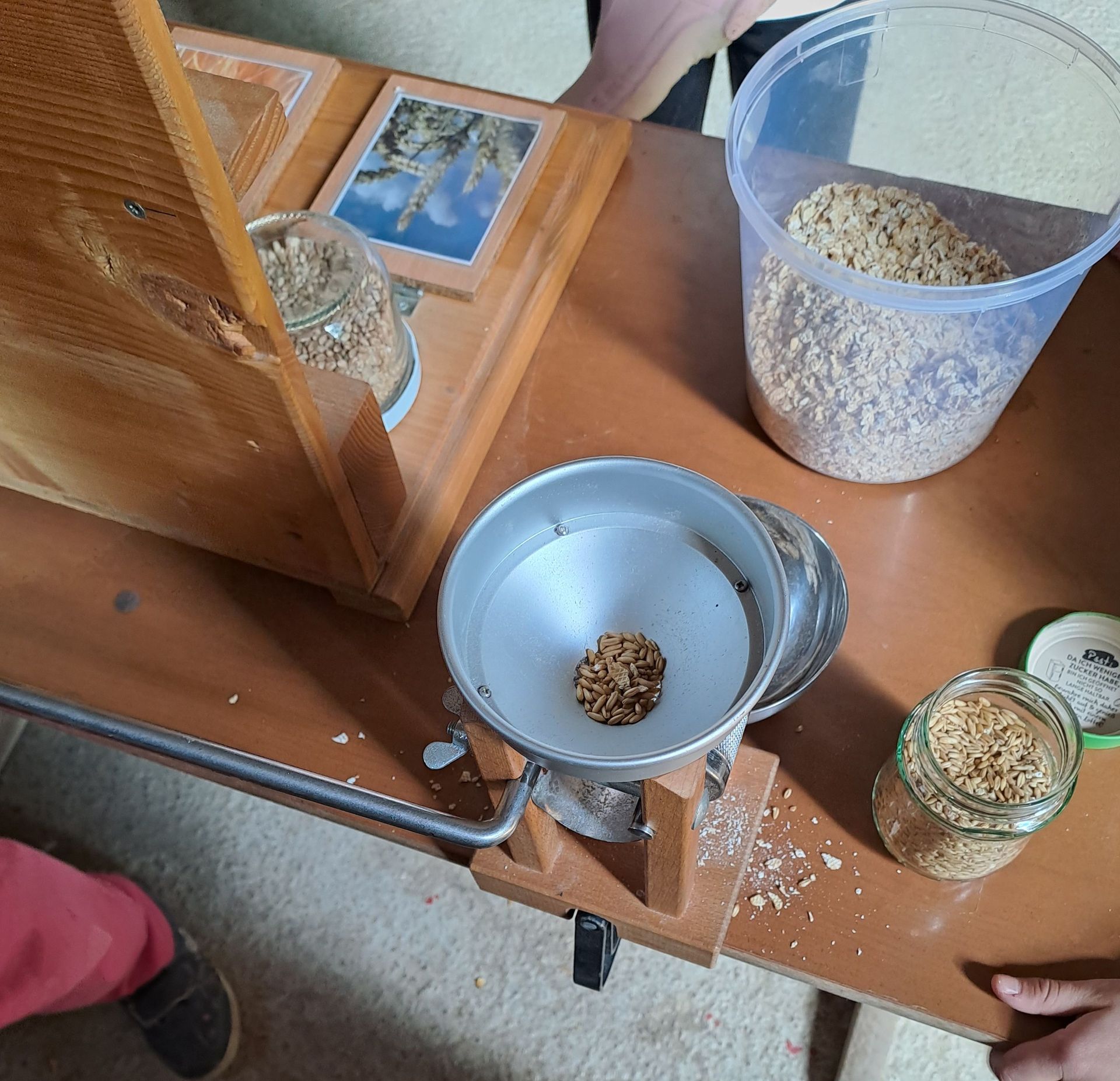 Hierbei besuchten die Klassen zum einen den Erlebnisbauernhof „Zum Hibsch“ in Hollenbach. Dort erfuhren die Kinder nicht nur Wissenswertes rund um das Thema „Ernährung und Landwirtschaft“, sondern durften auch tatkräftig mitanpacken und Tiere hautnah erleben: So konnten die Kinder zum Beispiel an einem Melkstand die Melktechnik erproben, eine „Pizza“ für Kühe backen und anschließend verfüttern, Hühner, Katzen und Kaninchen streicheln oder Getreidekörner mahlen und dadurch Haferflocken herstellen. Bevor es Butterbrote mit selbst hergestellter Butter gab, durften sich alle Kinder in einem riesigen „Maisbad“ und der Strohhüpfburg so richtig austoben.
